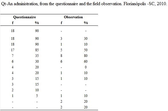 The subjects participating in the study were the professionals that make up the nursing staff (nurses, nursing technician and nursing assistant) of both sectors in the period from August to November 2010. To ensure confidentiality and anonymity of participants, workers identified by the letters N to nurse, T for nurse technician and A for nursing assistant, followed by growing numbers.
