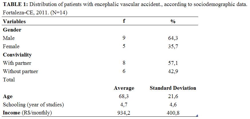 By analyzing the sociodemographic variables of the group of patients with CVA, we have discovered that they were predominantly male, 9 (64,3%) individuals; had coexistence with their partners, 8 (57,1%); average age of 62,3 years; average schooling of 4,7 years of studies; and average income of R$ 934,2/monthly. The variables of schooling and income showed higher concentration in low values, as shown in Table 1.