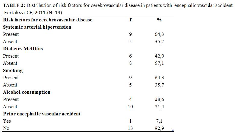We have identified the occurrence of risk factors for cerebrovascular disease and comorbidity, whose data are shown in Table 2. Accordingly, of the 14 (100%) patients hospitalized with CVA, 9 (64,3%) were hypertensive, 6 (42,9%) diabetic, 9 (64,3%) smokers, 4 (28,6%) consumed alcoholic beverages and 1 (7,1%) showed previous CVA occurrence. According to the evidenced facts, the found risk factors differ from those listed in a particular study, in which the patients with CVA in the city of Fortaleza, Ceará State, have high frequency of arterial hypertension and lower frequency of smoking and alcohol consumption6. Regarding the practice of physical activities, only two patients performed it, in walking modality, prior to the episode of CVA. Depending on the data, the patients hospitalized held comorbidities associated with the CVA occurrence, therefore, need to receive specific guidelines to control risk factors and prevent the manifestation of clinical complications.