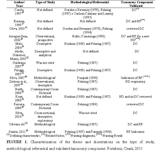 Thus, arose the following question: What studies have been developed involving clinical validation of taxonomies NANDA- International (NANDA-I),Nursing Intervention Classification (NIC) and the Nursing Outcomes Classification (NOC) in Brazilian Graduate Degree Programs Stricto Sensu?
