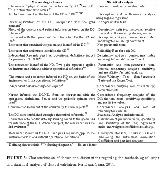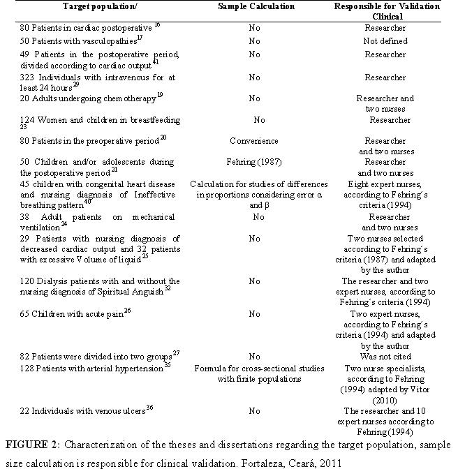 According to the emphasized, the most accurate way of studying a diagnostic test is to conduct a clinical trial, in which subjects are randomly assigned to receive the test or not. However, there may be some practical and ethical barriers to the development of such tests being provided care is taken on possible biases and confounding, observational studies on these issues may be useful31. As for the methodological approach, five studies have used only the validation model of Fehring, which also was adopted in conjunction with other, such as Fehring/Hoskins, Fehring/Goordon, Goordon; and Sweenwy /Fehring/Catalano , Fehring/Pasquali, Lunney, according to the Figure 1. This probably occurred because the Fehring validation model is quite typical for diagnostics. Such reference is considered by many as complex, however, quite reliable since its precepts are respected.