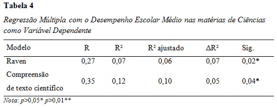 Por fim, para verificar se a compreensão de texto científico contribui para o desempenho em ciências uma regressão múltipla com o desempenho escolar médio nas matérias de ciências como variável dependente foi realizada controlando para inteligência não verbal. Os resultados mostram uma contribuição significativa da leitura de texto científico para o desempenho médio nessas disciplinas (ΔR² = 0,05; p = 0,04). A Tabela 4 mostra os resultados dessa análise.