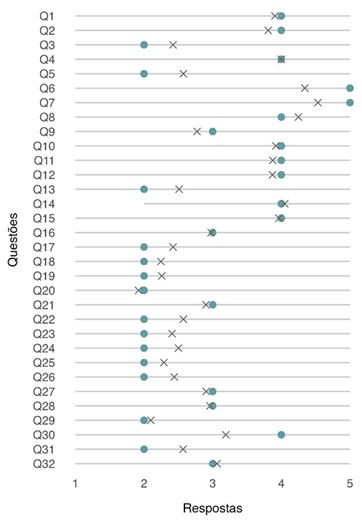 Na Figura 1 observamos as médias e medianas das 225 respostas das questões de 1 (Q1) a 32 (Q32) do Questionário de Auto Percepção do Envelhecimento (QAPE). Os pontos azuis indicam a mediana das respostas àquela questão. Os marcadores "x" indicam a média das respostas. As linhas em cinza se estendem do menor ao maior valor dado como resposta. A escala Likert utilizada no Questionário QAPE varia de 1 a 5, em que 1 corresponde a 'discordo totalmente' e 5 a 'concordo plenamente'. Essa escala foi aplicada para avaliar as percepções das participantes sobre o envelhecimento em diferentes domínios.