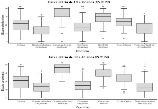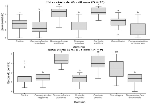 A Figura 2 apresenta o Boxplot dos escores dos sete domínios para as participantes. Entre 18 e 29 anos, não houve diferenças estatísticas nos domínios de consequências negativas, controle negativo, representações emocionais, cíclico e cronológico. Para 30 a 45 anos, os domínios de consequências negativas, controle negativo e representações emocionais foram semelhantes, com maior concentração de respostas positivas nos domínios de consequências positivas e controle positivo. Entre 46 a 60 anos, observou-se similaridade nos domínios de consequências positivas, controle positivo, cíclico, consequências negativas, controle negativo, cronológico e representações emocionais. Para 61 a 75 anos, os domínios de consequências positivas, controle positivo e cronologia foram semelhantes, enquanto os demais não apresentaram diferenças estatísticas.