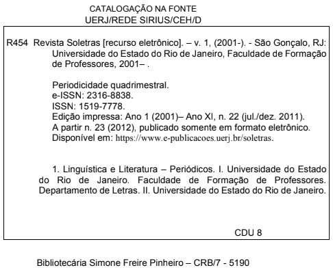 Ao submeterem trabalhos para serem avaliados pela revista, os autores atestam que os conteúdos dos artigos são originais, que representam contribuições de seus autores e não consistem em plágio no todo ou em parte, de outras obras, bem como concordam em ceder à revista os direitos não exclusivos de publicação, permanecendo livres para disponibilizar seus textos em outros meios desde que mencionada a publicação da primeira versão na revista Soletras.